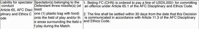 亚足联官方:因球迷亚冠二比赛期间扔杂物,国安被罚款5000美元 发布时间:2026-04-07 17:52:00 | 浏览: 次 直播信号源 一键直击直播 高清直播{看球热门} 热门直播 4k超清推荐 亚足联官网消息,北京国安因球迷在亚冠二级联赛对阵麦克阿瑟的比赛中向场内投掷杂物,被罚款5000美元。亚足联官网材料显示:1.北京国安违反了亚足联纪律与道德守则第65.1条 被罚款5000美元。2.北京国安观众在比赛期间向比赛场地及周边区域投掷了若干装有食物的塑料袋。3.根据亚足联纪律与道德准则第11.3条,该罚款需于处罚决定公布后30日内缴纳。 标签: 亚冠 国安 亚足联